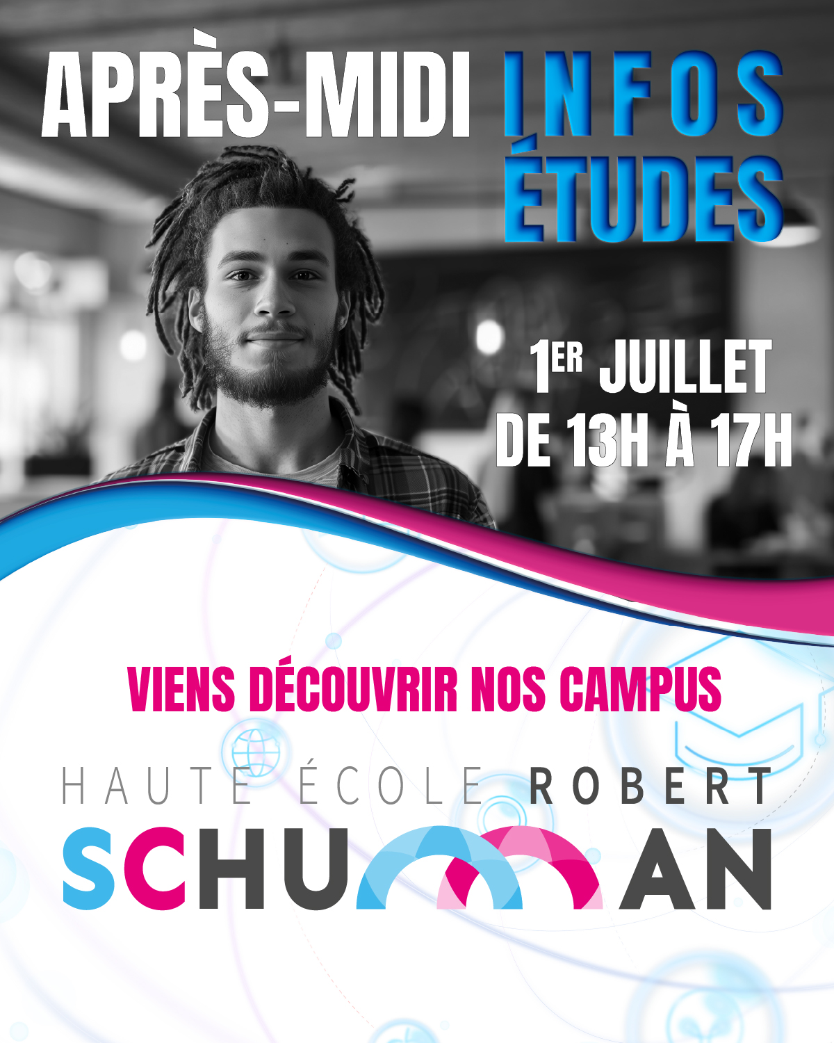 Tu as raté notre Journée portes ouvertes ? Tu souhaites poser tes questions avant de franchir le cap de l’inscription dans l’enseignement supérieur ? Les 3 campus de la Haute École Robert Schuman t’accueillent le mercredi 1er juillet de 13h à 17h pour une après-midi “Info-études”.